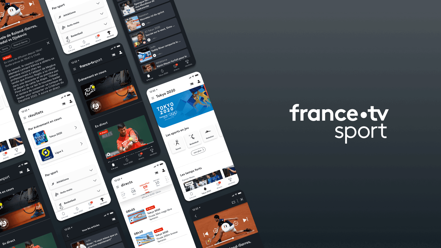 Par la suite, j'ai intégré l'équipe produit de France.tv sport en tant que Lead UI Designer. Dans un premier temps, mon rôle consistait à améliorer et maintenir les plateformes existantes, puis, dans un second temps, à mener une refonte complète des plateformes web et mobiles afin de couvrir les Jeux Olympiques de Tokyo 2020/2021. Profitant de cette opportunité, nous avons créé une librairie d'éléments UI qui s'intègre dans le Design System de France Télévisions, tout en respectant les normes d'accessibilité et en offrant une gestion optimale du mode clair et du mode sombre. Cette librairie a été conçue dans le but de favoriser la fluidité et la simplicité d'utilisation pour l'ensemble des collaborateurs de l'équipe produit.